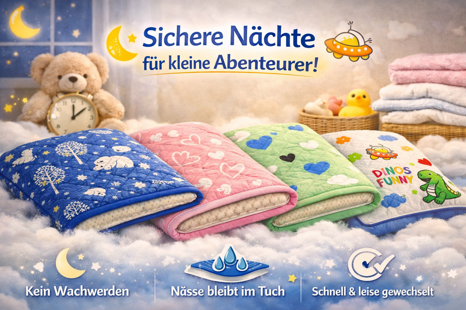 Keine knisternden Nächte, keine nassen Überraschungen – nur himmlisch ruhiger Schlaf. Unsere raschelfreie Bettschutzmatte fühlt sich an wie ein weiches Laken, schützt aber wie ein kleines Wunder.